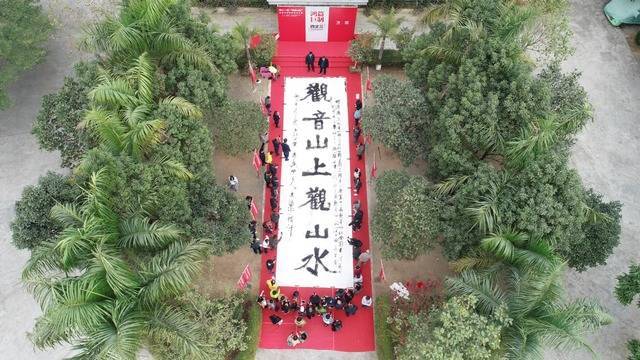 (图为其他书法家在东莞观音山挑战书写14米"观音山上观山水"巨型上联)