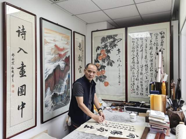 (图为书法家巢红武为东莞观音山创作书法)