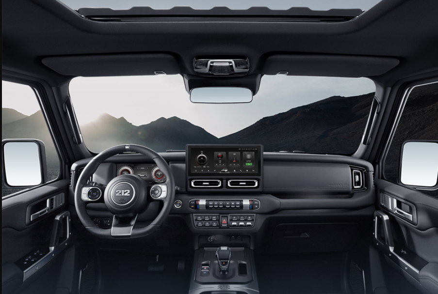 车内可谓是“铁汉柔情”,拉开车门,迎宾灯给你专属仪式感。虽说内饰风格还是有点212经典的“军味儿”,但新增的配色更时尚了。副驾饰板的这句“中国越野车,源于212”体现了它的情怀,而两块电子屏幕和中控实体按键则是科技与传承的碰撞。20秒快速升温的方向盘,在雪地暖暖的很贴心;带腰托和侧向支撑的座椅,在越野时稳稳的很踏实,座椅也支持通风、加热,还有按摩,谁说越野不能结合生活。